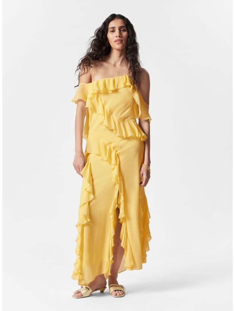 Add a pop of sunshine to your summer wardrobe with this Ruffle Maxi Dress in vibrant yellow. The flowing fabric is both elegant and comfortable, allowing you to move freely while looking effortlessly chic. The tiered ruffles along the hemline create a flattering silhouette, giving you a feminine and graceful appearance. The soft yellow color evokes warmth and joy, making this dress perfect for summer evenings or daytime celebrations. The sleeveless design keeps you cool, while the subtle ruffle details add texture and depth to the dress. Whether youโre walking along the beach or attending an outdoor wedding, this maxi dress will ensure you look radiant. Pair it with delicate jewelry or a wide-brimmed hat for a stylish touch. ๐ ๐๐ผ