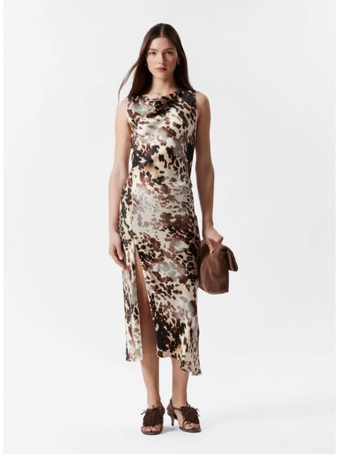The Draped Satin Midi Dress in brown exudes luxury and sophistication. The rich satin fabric catches the light beautifully, giving it a soft, elegant sheen. The draped design of the dress adds a relaxed yet polished look, and the midi length is flattering and feminine. This dress is perfect for an evening event or a special summer dinner. The brown color is earthy and versatile, making it easy to accessorize with gold or silver jewelry. The relaxed fit ensures comfort, while the satin fabric adds a touch of glamour. The sleeveless design and midi length provide just the right balance of coverage for warm evenings. Pair it with a pair of strappy sandals or heels to elevate your look. ๐๐