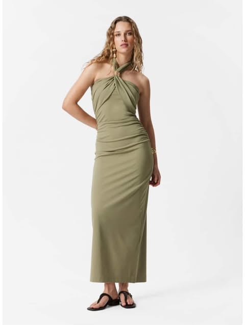 The Halterneck Midi Dress in vibrant green is the perfect mix of style and sophistication. This dress features a flattering halter neck design, which highlights your shoulders and elongates the neckline. The midi length gives it an elegant feel while still being ideal for summer wear. The green hue is fresh and energizing, making it a great choice for any daytime event or evening outing. The subtle pleats add texture and movement to the dress, making it ideal for twirling on a warm evening. Itโs a versatile piece that can be dressed up with heels for a night out or dressed down with sandals for a more casual look. The lightweight fabric ensures comfort, while the sleek design keeps you looking effortlessly chic. Pair it with simple jewelry or a statement handbag for a complete look. ๐๐โจ