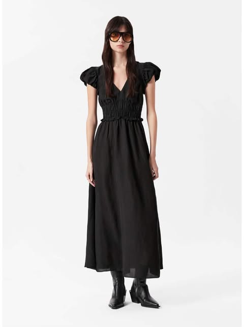 The Bubble-Sleeve Midi Dress in black is an effortlessly chic dress that stands out for its statement sleeves and flattering silhouette. The voluminous bubble sleeves give this dress a unique and trendy twist, while the midi length provides just the right amount of sophistication. The classic black color is versatile and perfect for any occasion, from a casual brunch to a night out. The dress has a cinched waist, which accentuates your curves, creating a flattering, feminine shape. The lightweight fabric is breathable and comfortable, making it suitable for warmer days. Pair it with bold accessories or keep it simple with delicate jewelry for a more minimalistic look. This dress is the perfect balance of trendy and timeless. ๐คโจ๐ค
