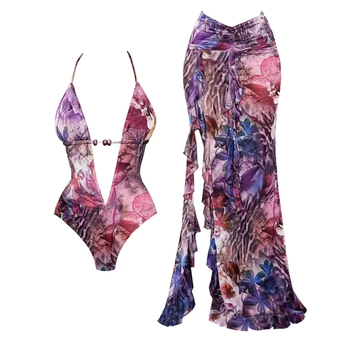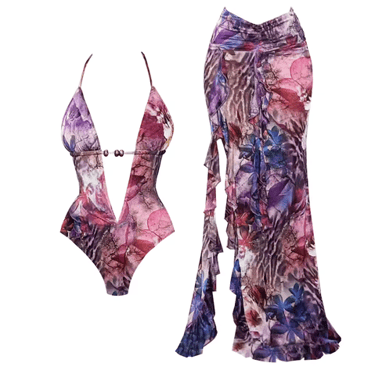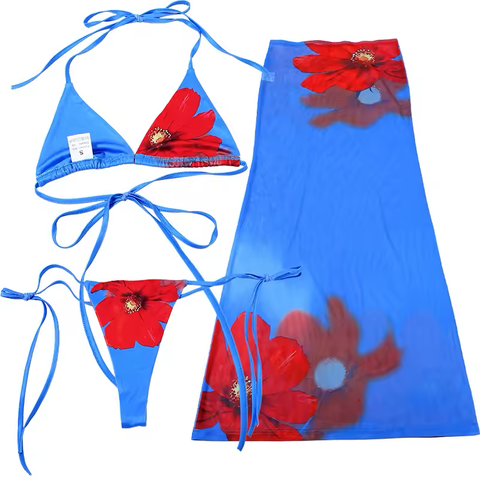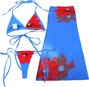 This three-piece floral dream includes a printed bikini top, bottoms, and a floor-length mesh skirt. The romantic design is ideal for beach vacations, honeymoons, or romantic seaside dinners. The skirt adds drama and movement to every step, like a walking Instagram moment. The mesh is soft and lightweight, perfect for warm weather. The vibrant flower print pops beautifully against sun-kissed skin. Wear it barefoot in the sand or with wedge sandals. The bikini itself is sexy yet secure, making it swim and photo friendly. Add a flower crown and layered necklaces to complete the dreamy beach goddess look. ๐บ๐ฃ๐ซ